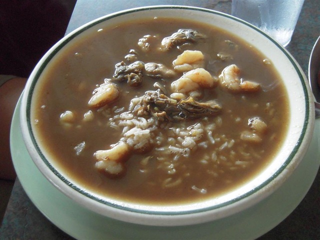 Jak szaleć to szaleć – następne na liście było gumbo – lokalny specjał przygotowywany z owoców morza, ryżu i mięsa. Sposobów przygotowania gumbo jest chyba sporo, bo co fotografia, to inny – przepisów i wariacji widziałam chyba ze dwadzieścia – niestety próbowałam tylko jednej. Gumbo mogą być przyrządzane z krewetkami, małżami, wieprzowiną, kaczką, kurczakiem, ostrygami, etc.. Mogą mieć pomidory, albo nie. Mogą być w postaci gulaszu lub zupy. Jednak istnieje parę punktów wspólnych, które wszystkie gumbo powinny spełniać, choć trudno się w tym zamieszaniu połapać. Po pierwsze, wygląda na to, że gumbo powinno mieć jako składnik ryż. Co nie zawęża grupy potraw w sposób znaczący, trzeba przyznać. Po drugie, gumbo jest gęste – do zagęszczenia używa się albo okry (niewielkich zielonych warzywek wyglądających jak małe, zielone, podłużne papryczki), albo zasmażki albo file, czyli zmielonych liści sassafras, drzew z rodziny wawrzynowatych. Wszystko wskazuje także na to, że gumbo powinno mieć lekko korzenny aromat, który uzyskuje się przez dodatek wędzonej szynki (tasso ham), kiełbasy (andouille) lub, w wersjach mocno uproszczonych, sosu Worcestershire. W moim gumbo pływały małże, krewetki i kawałki bliżej niezidentyfikowanego mięsa – być może była to właśnie wędzona szynka. Całość miała przyjemnie jałowcowy zapach i smak, była gęsta i pożywna. Znakomitym, chociaż chyba niezbyt klasycznym dodatkiem była gałka chłodnej, klasycznej i łagodnej sałatki ziemniaczanej – zestawienie palce lizać.