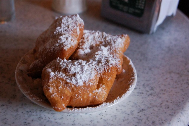 W Nowym Orleanie, idąc za radą Gabi, pomaszerowałam karnie do Cafe de Monde, aby spróbować słynnych beignetsów z kawą. Beignetsy podawane są tu w sporej ilości – trzy sztuki na porcję. Czworokątne, podobne odrobinę do tradycyjnych pączków, posypane są obficie cukrem pudrem i ułożone na niewielkim talerzyku. Nie wiem, czy ktoś z Was jadł kiedyś chleb tak świeży, że miękki miąższ parzył w palce i parował? Miąższ jest wtedy bardzo wilgotny, miękki i obłędnie pachnie. Takie właśnie jest wnętrze beignetsów. Dodać należy, że ciasto jest świeżutkie i ma sporo dziur środku – ktoś najwyraźniej pozwolił drożdżom wykonać ich zadanie. Zaskoczyło mnie to, że same w sobie nie są słodkie – ciasto ma delikatny smak, i jest bielsze niż w naszych pączkach, miłym uzupełnieniem jest chrupiąca i słodka od cukru pudru skórka. Na śniadanie dla prawdziwych łasuchów w sam raz ;-).
