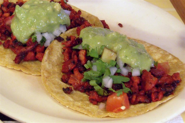 Wiedziałam, czego mogę się spodziewać, ale i tak porcja była olbrzymia. Spory (o średnicy około 25cm) placek z ciasta drożdżowego usmażony został w głębokim tłuszczu. Na gorącym, chrupiącym spodzie umieszczono sporą ilość dodatków. Bazę stanowi mięciutka biała fasolka w pikantnym sosie z wyraźnie meksykańską nutą. Na niej, już nieco bardziej w tonie tacos, cieszyły oko świeżo pokrojone w drobną kostkę pomidory, (ale bez kolendry), następnie spore ilości białej cebuli, delikatnej sałaty i czarnych oliwek (tak, tak, nie pytajcie mnie skąd oliwki w daniu Nawahów 😉 – zrobiło się fusion na całego). Na wierzchu całość posypana startym serem. Ukoronowaniem tego dania były sosy – po pierwsze salsa (czyli po hiszpańsku właśnie sos) z pomidorów, papryki, papryczek jalapenos i cebuli. Jak dla mnie to taka salsa mogłaby stanowić danie samo w sobie. Jeśli to tylko możliwe, to chętnie będę zajadać w ilościach nieograniczonych… Znakomitym uzupełnieniem ostrej salsy była bardzo gęsta, zimna, kwaśna śmietana. Gorący chrupiący placek, zimna śmietana, ostra salsa i do tego mnóstwo warzyw. Nie trzeba więcej.