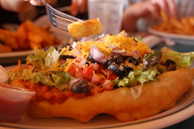 W budkach w Santa Fe, przy drodze i na indiańskim rodeo królem przekąsek jest tradycyjny smażony chleb nawaski, podawany bardzo często bez żadnych dodatków, na gorąco, z chrupiącą skórką, na brzegach mocniej wypieczony, z dużymi pęcherzykami powietrza, w środku bardziej płaski. Pamiętacie być może, jak pisałam o tacos, których podstawą jest w Meksyku niewielka kukurydziana tortilla, na którą nakłada się pomidory, wieprzowinę, i różnego typu sosy takie jak np. guacamole (zdjęcie obok). Navajo taco wygląda nieco inaczej. To gigantyczne taco złożone z tradycyjnego smażonego chleba Nawahów ze sporą ilością dodatków. Zamówiłam sobie ten smakołyk po raz drugi w tej samej knajpce, w której jadłam go dwa lata temu, i którą udało nam się odnaleźć i tym razem.