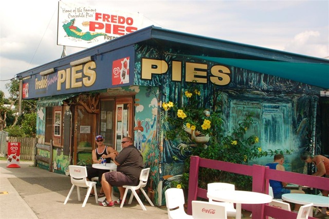 Budka z pajami W czasie naszej podróży z Brisbane w kierunku Sydney (niemalże 1000 km) Bernaś coraz częściej z uciechą wykrzykiwał: “Pies!, pies!” odnajdując znajome słowo na mijanych reklamach. Pies są w Australii najwyraźniej bardzo lubianą przekąską. Wiedzieliśmy, że prędzej czy później trzeba będzie ich spróbować, choć nie jest to potrawa polecana przez dietetyków – jeden niewielki pie (czyli paj – dalej będę używać spolszczonej wersji pisowni) dorównuje liczbą kalorii i zawartością tłuszczu fastfoodowym hamburgerom. No ale w końcu to gdzie będziemy jeść te paje? Przecież nie w Polsce. Ani nie w Azji.  Co prawda po drodze jeszcze Wielka Brytania została, ale kto by tyle czekał :-)… Aż w końcu nadszedł ten właściwy moment i zatrzymaliśmy się przy przydrożnym punkcie oferującym paje w rozmaitości wszelakiej.