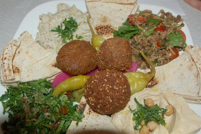 Mięsko rewelacja czyli Shawarma Shawarma – mięso wieprzowe (autorkę zawiódł tu zdrowy rozsądek i oddała się marzeniom – jak słusznie zauważono poniżej,  shawarmę przyrządza się niemal ze wszystkiego poza wieprzowiną, której muzułmanie nie jadają) zapiekane jak kebab na wielkich pionowych rożnach i podawane z pitą i sosem czosnkowym, też okazało się zaskoczeniem, bo przyprawione było – UWAGA! UWAGA! cynamonem! Nie uwierzyłabym nigdy, ale testowałam z niedowierzaniem kawałek po kawałku i za każdym razem wychodziło to samo. Cynamon! Tego jeszcze nie było. Chyba jeszcze trochę pieprzu lub gałki muszkatołowej się tam zaplątało, bo mięso było pyszne, z lekka przyrumienione na brzegach i wcale a wcale nie przypominało szarlotki. Buraczki za to zróżowiły się na talerzu, jakby je ktoś wygotował w barszczu ukraińskim, ale smakowały jak twardawe ogórki kiszone –  zupełnie nie do odróżnienia. Ich kolor dystyngowanie odpływał w stronę angielskiego różu. Na koniec pan nam przyniósł bliżej niezidentyfikowane (bo zamiast albo w charakterze rekompensaty za pomylonego wrapa) pizzopodobne trójkąciki bez sosu pomidorowego, ale za to z ziarnami czarnego sezamu. Znów nietypowo. Chyba wybierzemy się w kolejną podróż na Bliski Wschód.