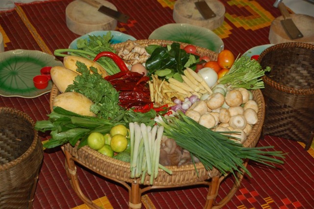 Kolorowo Najpierw poczułam się lekko oszołomiona, kiedy nasz instruktor zaczął wymieniać i pokazywać nam, w czasie naszej wizyty na targu, PODSTAWOWE składniki kuchni tajskiej. Wymienił trzy rodzaje imbiru (potem okazało się, że jest jeszcze jeden), liście i skórki lemonki kaffir (sok jest gorzki, więc wnętrze się wyrzuca), mleko kokosowe, trawkę cytrynową, różne gatunki chilli, trzy gatunki bazylii, dwa gatunki kolendry i świeżą kurkumę. Przy okazji zaprezentował nam także 5 różnych gatunków bakłażana pomijając wzgardliwym milczeniem wietnamski – podłużny i pozbawiony goryczy, ale za to pokazując nam bakłażany wielkości pomidorów, bakłażanki wielkości ziarenek grochu zwisające w gronach jak winogrona i jeszcze parę innych. Doprawdy istnym cudem ewolucji jest ta roślina.