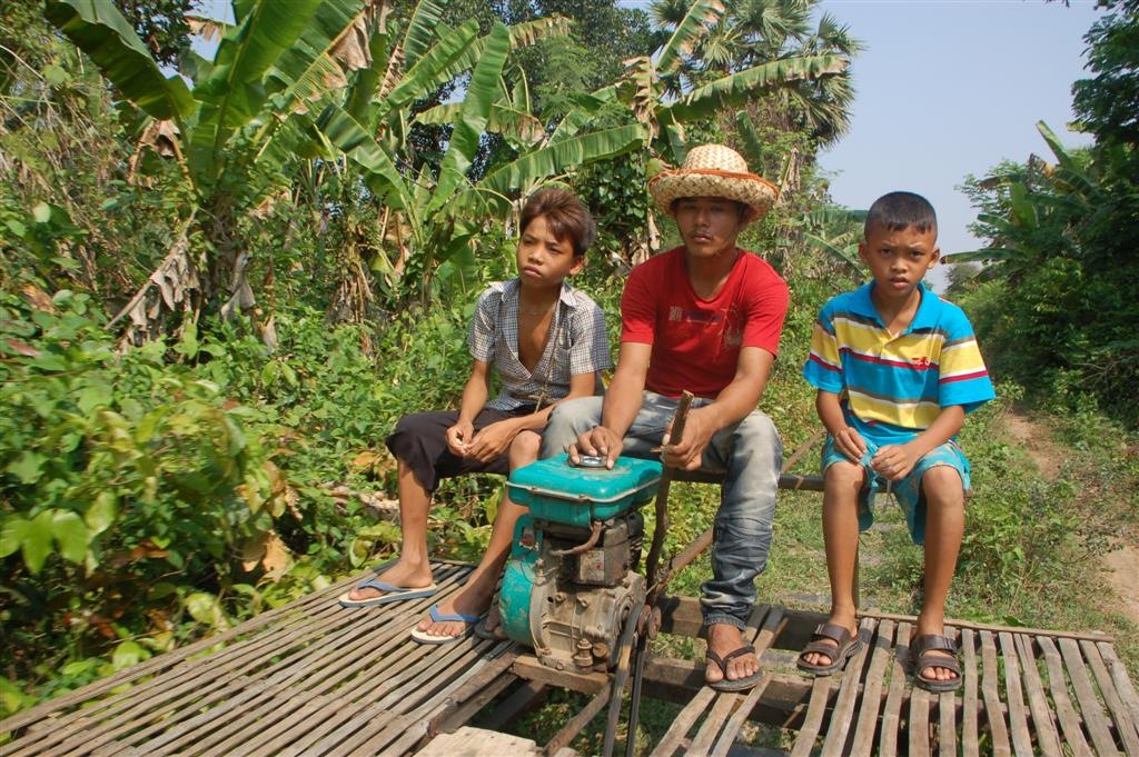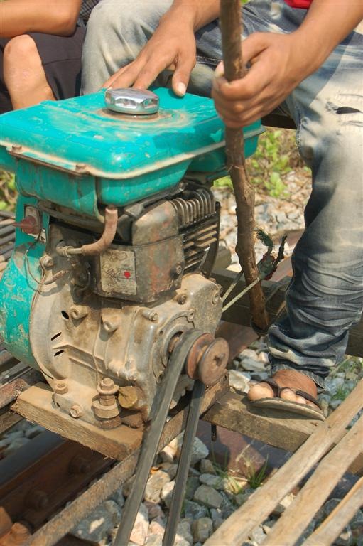 Sprzęgło No ale do rzeczy. Na czym to polega? Otóż koncepcja jest prosta: bierze się dwie osie od małych wagoników kolejowych (wyposażone w łożyska) oraz bambusową ramę – platformę, którą kładzie się na tych osiach (łożyska lądują w specjalnie wyprofilowanych drewnianych mocowaniach). Następnie umiejscawia się na platformie silnik od kosiarki, zakłada pasek klinowy łączący napęd z tylną osią, odpala się tenże silnik i dociska zmniejszając luz paska za pomocą drąga drewnianego zwanego po naszemu wajchą – uzyskując tym sposobem najprostsze pod słońcem sprzęgło. Prostota tej konstrukcji jest zachwycająca! W tym momencie pociąg rusza i zaczyna się zabawa. Po drodze bowiem mamy kilkudziesięciokilometrowy tor prosty jak strzała – ale nierówny, jak nieszczęsna Karmelkowa przed remontem. Pasażerowie siedzą sobie po turecku na bambusowej macie, krajobraz śmiga obok, gałęzie krzaków chlaszczą w tyłek (jechaliśmy z prędkością jakieś 15-20 km/h, więc niby nie szybko, ale przy pozycji niemal na ziemi wrażenia są niezłe), a maszynista dociska całość do toru siedząc na tylnej ramie.