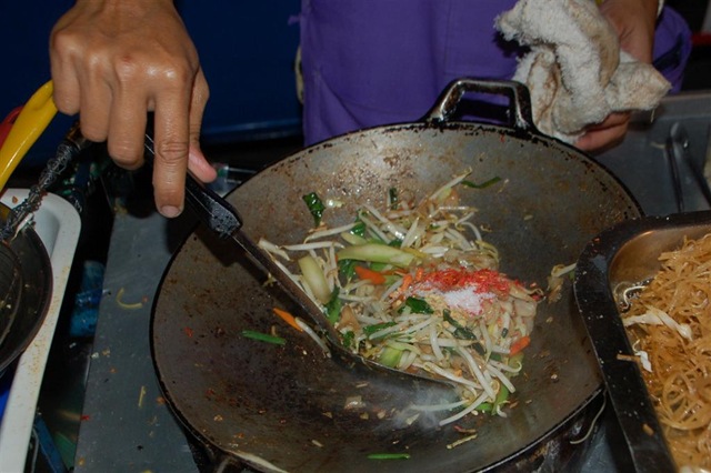 Pad thai Na Khao San Road, w dzielnicy backpackerskiej, można popróbować za to kuchni tajskiej popularnej. Każdy z nas miał coś ulubionego – a to sajgonki, a to pad thai, a to mango na klejącym ryżu. Pad thai jest daniem chyba najprostszym i najbardziej malowniczym. Spośród czterech kolorów makaronu (od żółtego aż do jasnobrązowego) wybiera się jeden i zasmaża się go następnie z cukrem, sosem rybnym, warzywami i sporą ilością kiełków fasoli mung w gigantycznym woku. Potem następuje misterium posypywania  i doprawiania, czym dusza zapragnie: suszonymi krewetkami, kruszonymi orzechami ziemnymi, kolendrą (jeśli akurat ją mają) i lemonką. Całość – pyszna, szczególnie z chrupiącymi orzeszkami i kiełkami usmażonymi szybko al dente. Im więcej orzeszków, tym lepiej. Pad thai smaży się wszędzie na ulicznych straganach na kółeczkach – jak akurat nie ma amatorów na tę potrawę, to przewozi się szybciutko i sprawnie cały majdan parę metrów dalej. Niech żyje prostota!
