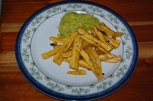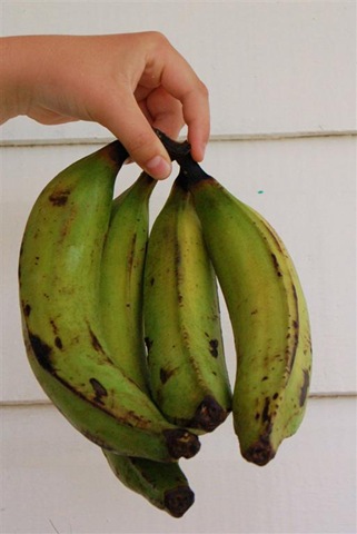 Przed Korzystając z niezwykle przyjaznego domku Lydii, w którym mieszkamy w Placencii (pięterko dla nas, hamaki i foteliki na tarasie, 60m do morza i dostęp do kuchni)  postanowiłam własnoręcznie przyrządzić coś prostego wykorzystując miejscowe smakołyki. Na pierwszy ogień (dosłownie i w przenośni) poszły plantany – zielone banany. Odkopałam wspomnienie z zeszłego roku, kiedy razem z Błażejem jedliśmy je przepysznie przyrządzone w chińskim bufecie w Nowym Jorku – wszystko wskazywało na to, że będą stanowić słodki, bardzo aromatyczny, a oprócz tego prosty w wykonaniu dodatek. Wspomnienie było na tyle silne i sugestywne, że na nim poprzestałam nie wykonując, niestety, żadnych poszukiwań internetowych, ale z zapałem rzucając się w wir eksperymentu kulinarnego. Od początku było trochę inaczej niż ze zwykłymi bananami – zaskoczyła mnie gruba, włóknista skórka, którą ściągało się ze sporym trudem. Obrane owoce pokroiłam w podłużne plastry i wrzuciłam na gorący olej. Gotowe wyglądały jak smażone banany o nieco bardziej zwartym miąższu – taki sam kolor i widoczne drobne nasiona wewnątrz owocu, stąd moje oczekiwania, że i smak będzie odpowiadał mojemu miłemu wspomnieniu z NYC. Jakież było moje zdziwienie,  kiedy okazało się, że smakują jak frytki – z dużą zawartością skrobi, ale jednak frytki. W duchu trochę się śmiałam z przewrotności losu – to ja tutaj pracowicie obrabiam te plantany, po karaibsku i na końcu świata, a frytki mi wychodzą… :-). Za to dzieci były w siódmym niebie…