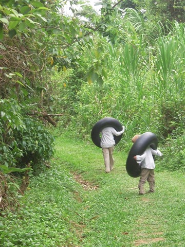 Idziemy na tubingCiężkie chmury zasnuły niebo nad wilgotnym lasem tropikalnym. Wszelki zwierz skrył się w gąszczu. Tylko dokuczliwe insekty wciąż polatywały nad wykarczowaną przez ludzi szeroką ścieżką. Jaguar w swym legowisku poczuł niekreślony niepokój. Wciągnął nosem wilgotne powietrze rodzinnego lasu. Tak, zna ten zapach. To zapach jego największego wroga – człowieka. Na ścieżce słychać głosy. Z zakrętu ukazują się cztery postacie, niosące na ramionach czarne dętki (oczywiście mówiąc dętki nie mam na myśli dętek od rowerów lecz czarne, lekkie opony z cienkiej gumy). Insekty spostrzegły ludzi i rzuciły się na nich jak sępy na padlinę, lecz zaraz zniechęcone zaciekłą obroną  odleciały w głąb dżungli. Ci ludzie to oczywiście my – rodzina Kotełków. Zaszyliśmy się w belizyjskim rezerwacie jaguara. Teraz idziemy zaliczyć jedną z jego głównych atrakcji – “tubing” (dosłownie “dętkowanie”), czyli spływ rzeką na oponach. Opony te wynajmuje się w centrum rezerwatu następnie idzie się do miejsca, gdzie leżą ich całe stosy i wybiera się rozmiar: