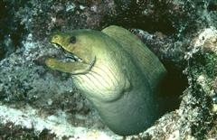 1) mureny zielone czające się pod koralami i wystawiające do nurków zęby (ang. green moray)