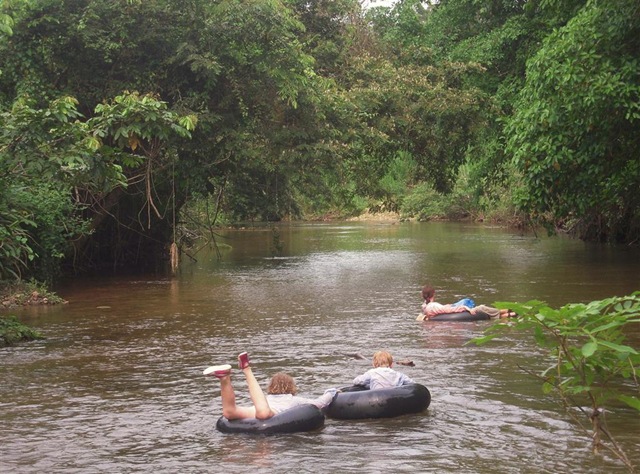 Potem sprawa jest prosta. Niesie się opony na ramionach przez 15 minut aż do wejścia oznaczonego tabliczką ”tubing entrance” i spływa się. Kiedy dotarliśmy do wejścia – małej, piaszczystej plaży – zdjęliśmy spodnie i buty (mieliśmy stroje kąpielowe/kąpielówki pod ubraniami). Aby któryś z czytelników nie pomyślał sobie “No jako to!? Spływ oponami na rzece, a oni spodnie i buty to gdzie będą trzymać?” muszę wyjaśnić, że rodzice trzymali nasze rzeczy w workach foliowych na własnych brzuchach (na oponach rodzice leżeli na plecach, a my na brzuchu). Następnie włożyliśmy opony na wodę i wskoczyliśmy na nie.