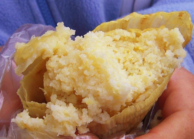 Specjałów kukurydzianych jest tu mnóstwo. Zacznijmy od humitas na słodko. W Quito i w okolicach podawane są z kawą i stanowią tradycyjne ekwadorskie śniadanie. Jest to rodzaj przepysznych i delikatnych zawijasków z gotowanej i rozdrobnionej kukurydzy z dodatkiem odrobiny cynamonu zawiniętych w zewnętrzne liście kolb kukurydzianych i gotowanych na parze. Brak mi słów, żeby opisać to cudo. Ciepłe, pachnące kukurydzą, lekko słodkie, rozpływające się w ustach i sycące stanowią według mnie znakomite śniadanie. Jeśli chodzi o porównanie do znanego mi smaku to jedyne, co mi się nasuwa to domowy kuskus, który jadłam kiedyś w marokańskiej restauracji w Londynie. Podobna struktura i delikatność, inny aromat. Istnieje także wersja słona humitas, ale tak się zakochałam w słodkiej, że żadnych innych nie próbowałam :-), ale ponieważ są one także przygotowywane w Peru, Chile i Argentynie, więc istnieje szansa, że jeszcze mi się uda. Potrawą pokrewną do humitas, choć nie tak wykwintną, są wyrośnięte quimbolitos, serwowane z wielkimi ciemnymi rodzynkami na wierzchu owinięte w liście paciorecznika indyjskiego. Potrawa ta jest pyszna i niewielka, ale strasznie sycąca – po jednym quimbolito można pęknąć jak smok wawelski.