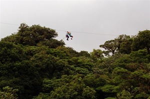 Canopy  KostaryceCanopy widzieliśmy już wcześniej, ale jak się okazuje, pierwsze takie komercyjne na świecie zrobił pewien Kanadyjczyk właśnie tu w Monteverde w Kostaryce. Potem zresztą opatentował nazwę i chciał namówić innych właścicieli podobnych parków (których mnoży się wszędzie mnóstwo) do płacenia mu “tantiem”. Oczywiście to się nie udało i dzięki temu rynek jest normalny, a konkurencja wyraźna. Zafundowaliśmy sobie oczywiście taką atrakcję zaliczając dziś park Selvatura. Co to takiego jest? Canopy, albo zip-line, czyli nasza tyrolka to po kostarykańsku szereg zjazdów w uprzęży po stalowych linach rozpiętych w tropikalnym lesie. Albo nad tropikalnym lasem. Tak w sumie to czasami wysoko nad lasem. I czasami liny są długie. Albo bardzo długie. Słowem – niezła jazda! Dość powiedzieć, że najdłuższa lina, którą dziś jechaliśmy miała ponad pół kilometra długości! W sumie było ich kilkanaście plus mnóstwo wiszących mostów, po których można spacerować oraz jeden szalony “skok Tarzana”, czyli skok na zwisającej z góry linie z platformy w głąb dżungli – uczucie podobne do bungee jumping. Dzieci oczywiście też zaliczyły wszystko, przy czym Bernaś cały czas z instruktorem, a Isia tylko na niektórych (gdzie okazywała się za lekka). Najlepszą część, czyli skok Tarzana zaliczyli wszyscy samodzielnie (przy czym dziewczyny piszcząc, a Bernaś krzycząc “Tarzan!”). Wrażenia niesamowite, widoki przecudne. Dodatkowo na końcu zaczęło lekko padać, a las okryła mgła. Jechało się jeszcze lepiej – tajemniczo, jak przez jakiś park jurajski. Zobaczcie sami: