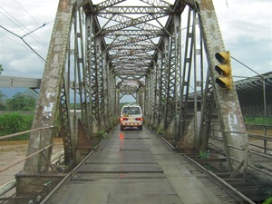 Most lekko niepewnyPrzewodnik mówi, że drogi w Ameryce Środkowej są w bardzo złym stanie – no i rzeczywiście w porównaniu do któregokolwiek cywilizowanego kraju Europy Zachodniej, tak jest. Ale mieszkaniec Wrocławia jeżdżący często ulicą Karmelkową nic specjalnie złego o kostarykańskich drogach powiedzieć nie może. 🙂 Są owszem dziury i czasami dziwne dla nas oznaczenia (np. ograniczenia prędkości tylko wymalowane na drodze), ale ogólnie nic strasznego. Jedynie niektóre stare mosty (zdjęcie obok) wywołują dreszczyk emocji. Najciekawszy nie miał na kilku metrowych odcinkach blach pokrywających konstrukcję (pewnie ciężarówki rozwaliły) i trzeba było kołami celować w stalowe belki, bo inaczej opona mogłaby wpaść do dziury. A na dnie dziury rwąca rzeka! Standardem są też druty stalowe leżące w poprzek mostu – przejeżdża się nie po metalowej płycie, tylko po leżących drutach. Hałas, jaki to wywołuje, jest nie do opisania. Nie wszystkie mosty są takie – jest wiele nowych, całkiem porządnych. Natomiast ogólnie drogi podrzędne są tak podrzędne, jak wioskowe drogi u nas. Duże drogi zaś takie, jak nasza “ósemka” do Kudowy – tylko bez poboczy. A autostrady koło San Jose mniej więcej takie, jak “autostrada” koło naszej stolicy (czyli zwykła dwupasmówka zatłoczona jak diabli).