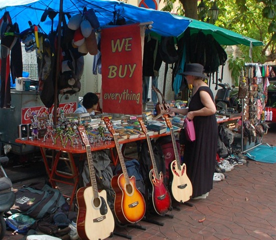 Na Khao San Road, w dzielnicy backpackerskiej, można popróbować za to kuchni tajskiej popularnej. Każdy z nas miał coś ulubionego – a to sajgonki, a to pad thai, a to mango na klejącym ryżu. Pad thai jest daniem chyba najprostszym i najbardziej malowniczym. Spośród czterech kolorów makaronu (od żółtego aż do jasnobrązowego) wybiera się jeden i zasmaża się go następnie z cukrem, sosem rybnym, warzywami i sporą ilością kiełków fasoli mung w gigantycznym woku. Potem następuje misterium posypywania i doprawiania, czym dusza zapragnie: suszonymi krewetkami, kruszonymi orzechami ziemnymi, kolendrą (jeśli akurat ją mają) i lemonką. Całość – pyszna, szczególnie z chrupiącymi orzeszkami i kiełkami usmażonymi szybko al dente. Im więcej orzeszków, tym lepiej. Pad thai smaży się wszędzie na ulicznych straganach na kółeczkach – jak akurat nie ma amatorów na tę potrawę, to przewozi się szybciutko i sprawnie cały majdan parę metrów dalej. Niech żyje prostota!