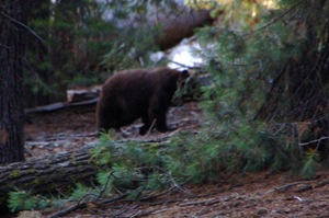 Wczoraj na popołudniowym spacerze po lesie (w zasadzie w drodze do gigantycznego lasu pełnego sekwoi) spotkaliśmy w sumie 6 misiów uszatków w ciągu 3-4 godzin. Jeden przeszedł nam przez szlak jakieś 50 metrów od nas i poszedł w las. Drugi w drodze powrotnej (już zaczynał się wieczór) spacerował sobie jakieś 30 metrów od nas po drodze prowadzącej do parkingu. Zrobiło się groźnie tym bardziej, że ludzi wokół już nie było. Trzeciego spotkaliśmy przy samym parkingu, gdy kręcił się w okolicach toalet (to był ten czarny, po pozostałe były chyba brunatne). Była już jakoś osiemnasta i zaczął powoli zapadać zmrok. Postanowiliśmy (jakoś tak dość szybko i zgodnie) nie wracać szlakiem przez las (samochód mieliśmy na innym parkingu, jakieś 4 km dalej) tylko drogą. Po przejściu kawałka szosą zauważyliśmy jakieś 50m w las mamusię misia z dwojgiem małych wesoło baraszkujących w krzakach (mamusia wyraźnie coś wygrzebywała łapą). Jak wiadomo mamusia z dziećmi to strach razy dwa, wiec zrejterowaliśmy za pomocą opcji autostopu w postaci niemieckich turystów ze sporym vanem, którzy chcieli owszem pójść na wieczorny spacer, ale po zobaczeniu misia na parkingu zawrócili i uznali, że … jutro też jest dzień.