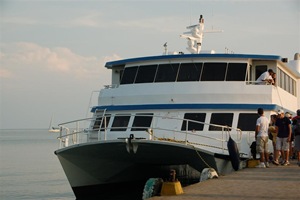 W biurze turystycznym udało nam się znaleźć firmę, która ma łagodne zasady i jest przyjazna rodzinom. Powiedziano nam, że można będzie zrobić tak, jak chcemy – nawet wymogliśmy telefon z pytaniem, czy aby na pewno. Uradowani wpłaciliśmy zaliczkę i rano stawiliśmy się w porcie. Katamaran z 60 turystami i 10 osobami załogi ruszył z portu punktualnie o 8 rano. Po drodze odbyliśmy szkolenie z zasad bezpieczeństwa (idiotoodporne kamizelki ratunkowe), briefing nurkowy (w tym mapka rafy) oraz dopasowaliśmy sprzęt dla siebie i dzieci – w tym seksowne kombinezony antymeduzowe od stóp do głów (meduzy typu Stinger są bowiem plagą wybrzeży Australii w lecie i niestety ich oparzenie może być śmiertelne w skutkach). Gdy już byliśmy już ubrani w niebieskie wdzianka i prawie gotowi do wejścia do wody okazało się, że jest problem. Jedno z nas musi bowiem zostać na pokładzie z dziećmi, bo firma nie może wziąć odpowiedzialności za dwójkę brykających w otwartym oceanie dzieciaków (w tym jedno młodsze słabo mówiące po angielsku). No niby ich rozumiemy i samy na ich miejscu byśmy się nie zgodzili (prawdę mówiąc zdziwiliśmy się wcześniej, że to potencjalnie możliwe – taka dla nas darmowa opieka nad dziećmi :-)), ale z drugiej strony czemu sprzedali nam taki pakiet (robiąc jeszcze zniżkę – trzecie nurkowanie w cenie dwóch). Jak sobie to w takim razie praktycznie wyobrażacie, że dzieci snorklują, a my nurkujemy 3 razy każde z nas na zmianę? – pytamy szefową pokładu.