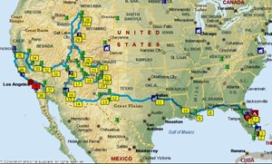 Teraz przed nami kilkanaście stanów, 56 dni i około 10 tysięcy km do przejechania! Obok wstępnie i zgrubnie planowana trasa. Podkreślam, że planowana, bo jak to w takiej podróży wszystko może się zmienić. A trasa w szczególności! Może też i wy coś nam zasugerujecie, bo w końcu mamy trochę czytelników znających USA! Planujemy generalnie przejazd południem Stanów na południowy-zachód i tam buszowanie po okolicach i po parkach narodowych. Zaczęliśmy od Florydy – Miami, park Everglades, plaże i przylądek Canaveral (relacje i zdjęcia już wkrótce), potem będzie południe Stanów z Nowym Orleanem, raczej szybki przejazd przez Texas, Nowy Meksyk oraz Roswell i może wizyta w muzeum UFO, potem pustynie i klimaty Dzikiego Zachodu, podobnie Arizona (rezerwaty Indian koniecznie), powrót przez Nowy Meksyk (przez Santa Fe) bardziej na północ przez Góry Skaliste do Mesa Verde i Arches. Pierwotna wersja zakładała 1000 km (jedynie 🙂 ) skok na północ do Grand Teton i parku Yellowstone, ale prawdopodobnie zostaniemy na południu, a te dwa piękne parki odwiedzimy kolejnym razem. Później planujemy jeszcze Grand Canyon, Death Valley, Sequoia National Park i na koniec Kalifornię, czyli Yosemite National Park, San Francisco, Joshua Tree National Park i może na deser San Diego. Wylatujemy dalej drugiego października z Los Angeles!