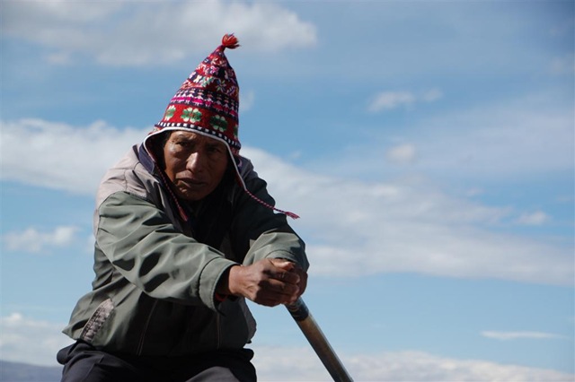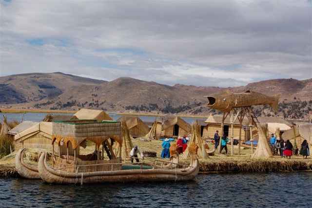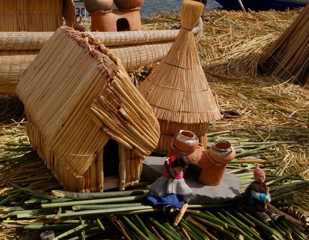 A oto co powiedział nam miejscowy na temat ich konstrukcji: “Najpierw budujemy pływające platformy z resztek zgniłych roślin, następnie wbijamy w nie drewniane paliki i złączamy je sznurem. Potem kładziemy na nie na przemian kilka warstw tortory – w ten sposób otrzymujemy pływające tratwy. Następnym krokiem jest przywiązanie się do dna – nie chcemy odpłynąć do Boliwii, nie mamy paszportów! Stawiamy domki, stożkowate kuchnie. Mama, tata – i gotowe!” – dokończył stawiając na modelu wyspy dwie figurki.