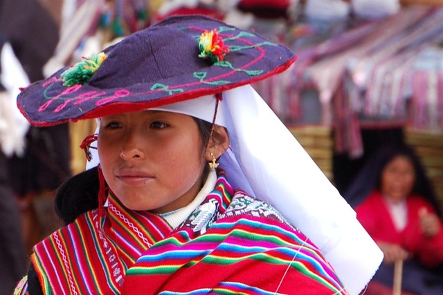 O ile Amantani sprawiało wrażenie wysepki gdzieś na końcu świata, to wyspa Taquile, do której popłynęliśmy następnego dnia była już dużo bardziej nastawiona na turystów. Właśnie trwało święto św. Jakuba – Indianie w tradycyjnych strojach – mężczyźni w tęczowych (kolory imperium inkaskiego) stroikach na głowach i kobiety w puchatych wielowarstwowych spódnicach tańczyli i grali na fletach na placu przed kościołem, z którego następnie wyniesiono kielich z komunikantami, oraz figurkę św. Jakuba – najwyraźniej najważniejszej osobistości tego dnia. Wracaliśmy trzy godziny drewnianą łodzią pełną lokalnych mieszkańców. Kobiety siedziały na podłodze zawzięcie szydełkując i z upodobaniem strzelając balonami z gumy do żucia, chłopak naprzeciwko w sportowej bluzie jakiegoś klubu robił na drutach jak szalony (tradycja Taquile) – wydziergał rządek lam przez ten czas. A dzieciaki uczyły turystów z karaibskiego Curaçao grać w makao oraz w “idę na ryby”.