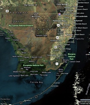 Pierwsze, co zrobiliśmy po przyjeździe USA, to wizyta w parku narodowym Everglades. W końcu lądowaliśmy w Miami, a jesteśmy już wprawionymi turystami przyrodniczymi. Zawsze myślałem, że Everglades to pełne bagien lasy zamieszkałe głównie przez aligatory. A tu sie okazuje, że jest to wielka rzeka słodkiej wody, rozpoczynająca się prawie w połowie Florydy i mająca kilkadziesiąt kilometrów szerokości. Ta powolna, płytka rzeka przepływa przez tereny trawiaste tworząc tak naprawdę wielką łąkę zalaną słodką wodą. Wodą, która nieustannie i powoli porusza się w stronę morza. Nawet na zdjęciu satelitarnym południowej części Florydy można zobaczyć nurt tej rzeki. Proponuję poeksperymentować z Google Maps, Google Earth lub Bing Maps (zdjęcie obok pochodzi właśnie z tego ostatniego). W naturze wygląda to bardzo ładnie, żyją tam żółwie (widzieliśmy!), aligatory (też widzieliśmy!) oraz całe mnóstwo ptaków. Teren jest olbrzymi i oczywiście najlepsze widoki i kontakt z naturą jest w czasie wędrówki pieszej lub łodzią w głąb parku (jest sporo miejsc campingowych na mapie). Jest tylko jedno ale. Komary! Cholerne komary! Zaatakowały nas już pierwszego wieczoru (spaliśmy wtedy blisko granicy parku) i nie odpuszczały do końca. Gryzą szybko i zdradliwie. Niby samo ukucie nie boli tak jak od polskiego komara jeziornego, ale bąbel swędzi potem krótko i piekielnie. Po chwili widać też sporą banię na skórze, bo zdaje się, że reakcja obronna organizmu jest poważna (nie znam się na tym, ale tak mówi Beata). Tak więc na drugi dzień po zwiedzeniu parku i zrobieniu wielu zdjęć zwialiśmy na Florida Keys (wysepki na samym południowym czubeczku Florydy) zażyć nieco słońca i piasku.