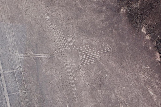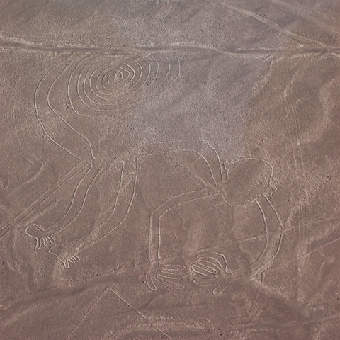 12:15. Kondor, koliber, pająk i inne zwierzaki na dole. Widać je bardzo wyraźnie – wyrysowane na płaskowyżu, niektóre na zboczach gór. Linii jest mnóstwo: trapezoidy, schodzące się do jednego punktu, fragmenty rysunków nieopisane na poglądowych mapkach. Przecięte z jednej strony Panamericaną, w niektórych miejscach lekko przetarte, w innych bardzo wyraźne. Jak oni to właściwie zrobili? I po co? Pokazują bogom, że trzeba deszczu?