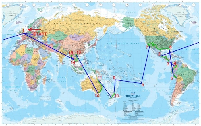 Zaczynamy skokiem z Wrocławia do Londynu (1), potem lecimy do Mexico City (2), przemieszczamy się lądem przez całą Amerykę Centralną do San Jose w Kostaryce (3), przeskakujemy do Quito w Ekwadorze (4), jedziemy do Limy w Peru (5) zwiedzając co się da, potem Miami (6) i RoadTrip przez całe USA aż do Los Angeles (7), następnie Polinezja Francuska (8) i Fiji (9), lądujemy w Nowej Zelandii (10), którą przejeżdzamy z północy na południe; następnie to samo w Australii z Cairns (11) do Melbourne (12); potem lecimy do Bangkoku (13), stamtąd do Yangoon w Birmie (14), a potem do Ho Chi Minh w Wietnamie (15), zwiedzamy Wietnam, Kambodżę i Tajlandię, wracamy do Bangkoku (16) i nastepnie zamykamy pętlę w Londynie. A potem to już tylko do domu, czyli do Wrocławia.